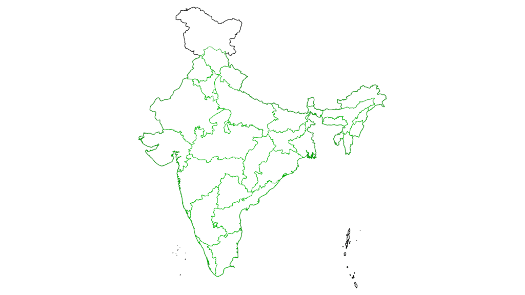 This version shows only the outlines of India’s union territories (UTs) along with the main outline of the country. UT borders are highlighted in green for easy identification.